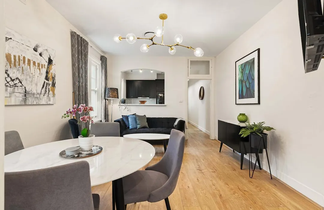 There is also a fully equipped kitchen, fitted with an oven and a dishwasher. This 1-bedroom apartment is in the vicinity of the Bridge Street city rail.
